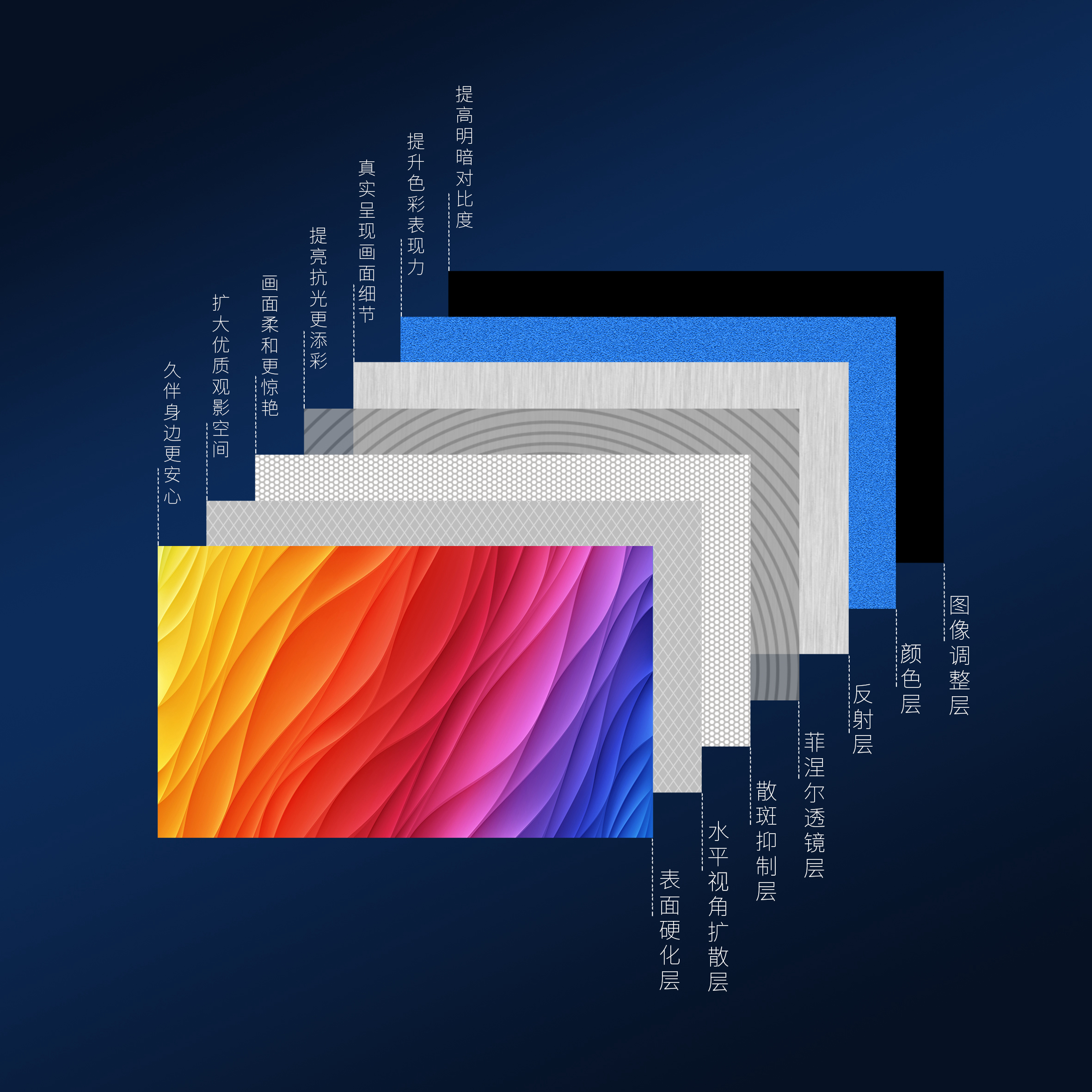 美视菲涅尔抗光投影幕DY1D是针对超短焦投影仪专门开发的激光电视专用幕,包含 6 层光学结构层。其原理是基于菲涅尔透镜特殊的结构特性,搭配纳米级金属粒子涂层等功能层,达到吸收环境光,提升中心视角亮度,增加对比度和色彩饱和度的作用。