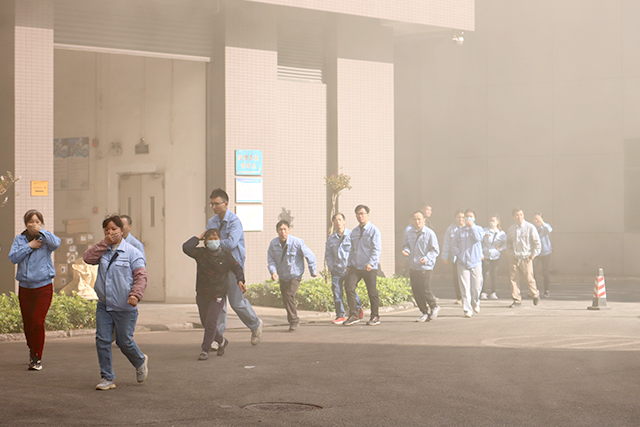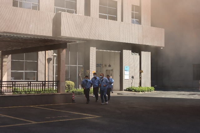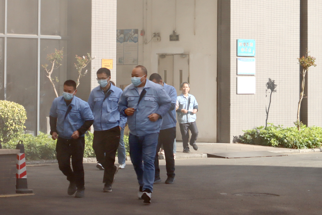 演练模拟公司内某区域突发火灾为场景,随着火警警报正式拉响,演练迅速进入实战状态。美视应急小组就位,疏散引导员工通过“弯腰捂鼻,靠右快走”的清晰指引,沿预设安全路线有序撤离;同时消防队灭火行动组携带器材快速赶赴“火情”现场,熟练开展初期火灾扑救;整个过程紧张有序、协同高效,短短几分钟内全员安全抵达指定集合点并完成人数清点确认。